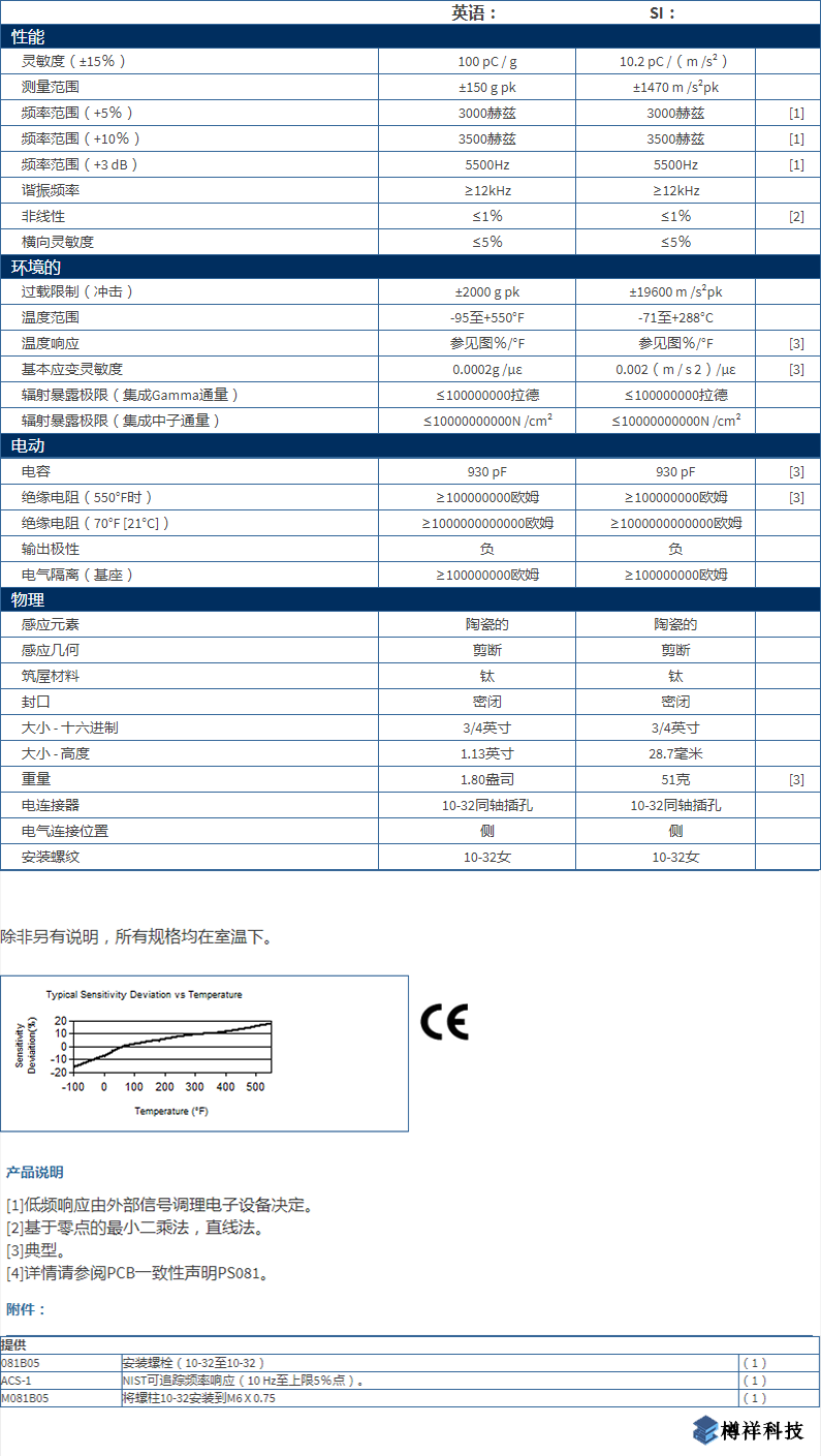 美國進(jìn)口PCB單軸加速度振動(dòng)傳感器357B53型,電荷輸出加速度,100 pC / g,150g,3kHz,10-32側(cè)連接,高溫。+550 F(+288 C),Rad Hard靈敏度:(±15%)100 pC / g(10.2 pC /(m /s2))測(cè)量范圍:±150 g pk(±1470 m /s2pk)頻率范圍:(+ 5%)3000 Hz重量:1.80盎司(51克)。