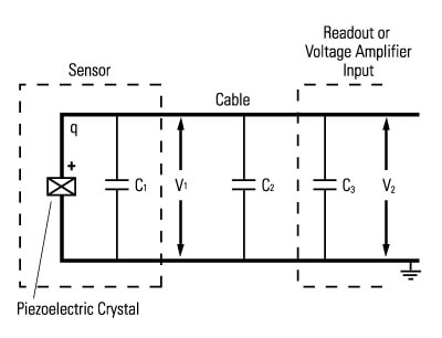 這些電壓模式系統(tǒng)的示意圖包括傳感器,電纜和電壓放大器或讀出設(shè)備的輸入電容,如圖2所示。絕緣電阻(信號和地之間的電阻)假設(shè)很大(> 10 12歐姆)和因此未在原理圖中示出。
