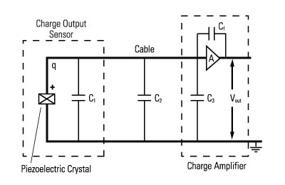 圖4顯示了電荷放大系統(tǒng)的示意圖,包括傳感器,電纜和電荷放大器。再一次,絕緣電阻(信號和地之間的電阻)假設(shè)很大(> 1012歐姆),因此不是如圖所示。