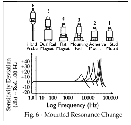 提到的所有其他方法都會降低傳感器的上限頻率范圍。通過移除傳感器與測量點的緊密接觸并插入諸如粘合墊,磁鐵或探針尖端的替代安裝件,引入安裝的共振。這種安裝的諧振低于傳感器的自然諧振,并降低了頻率范圍。傳感器從測量點移開得越遠,安裝的諧振越低,可用頻率范圍越小。圖6展示了這種安裝的共振變化。