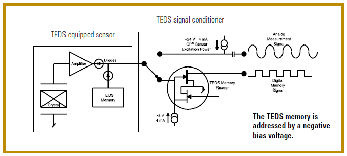 TEDS存儲器電路與傳統(tǒng)的信號調(diào)理電路一起內(nèi)置在ICP®傳感器中。二極管隔離方案有助于ICP®傳感器電路和TEDS電路之間的切換。傳感器將用作普通測量設(shè)備,并在使用傳統(tǒng)正電壓正向偏置時輸出模擬測量信號。當傳感器反向偏置并暴露在負電壓下時,可以訪問TEDS存儲器。