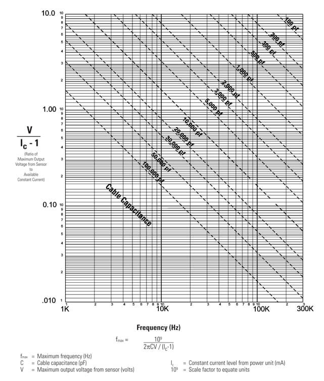 例如,當運行電容為30 pF / ft的100英尺(30.5米)電纜時,總電容為3000 pF。該值可以沿對角電纜電容線找到。假設(shè)傳感器工作在5伏的***大輸出范圍并且恒流信號調(diào)節(jié)器設(shè)置為2毫安,則垂直軸上的比率可以計算為等于5.總電纜電容與該比率的交點導(dǎo)致***大頻率約為10.2 kHz。