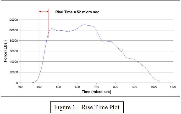 圖1是力傳感器在測(cè)試期間可能經(jīng)歷的事件上升時(shí)間的曲線圖。保持傳感器上升時(shí)間比事件的上升時(shí)間短得多是很重要的。如果事件上升時(shí)間較短,則傳感器的共振頻率將被激發(fā)并疊加在記錄的數(shù)據(jù)上。PCB ® 負(fù)載單元1102-01A不會(huì)此事件合適的傳感器。它的上升時(shí)間為89.2微秒,數(shù)據(jù)中會(huì)出現(xiàn)明顯的振鈴。石英ICP ®力傳感器202B不會(huì)有與事件該短以與實(shí)施例1中計(jì)算出的4.1微秒的上升時(shí)間的問題。